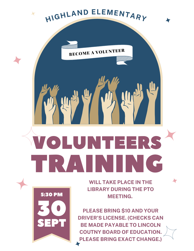 Hello Highland Families, Our PTO Election Results are as follows: President- Contessa Long Vice President- Maddie Adams Secretary- Emily Hoover Treasurer- Leighanne Hurt Please join us on Tuesday, September 30th at 5:30 in the library to meet our new officers, complete our volunteer training, and sign up for volunteer opportunities. Volunteer training is $10, which will cover the cost of the background check. Please bring exact change or make a check payable to Lincoln County Board of Ed.